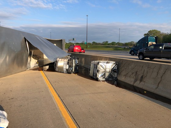 HAMMOND, IN (TruckingNewsNow.com) (Source: Indiana State Police @ 8:45 ET May 15, 2019) –Three left lanes are closed east bound on I-80/94 at Calumet Avenue. A semi hauling containers of “Amber Honey” lost control and rolled over. The semi was hauling 41,000 pounds of the honey. Five of these containers came out of the box trailer and there are still eight inside, at least four of these containers are leaking. It appears the semi was coming onto east bound I-80/94 from Calumet Avenue when his front axle broke which caused the driver to lose control and roll over.